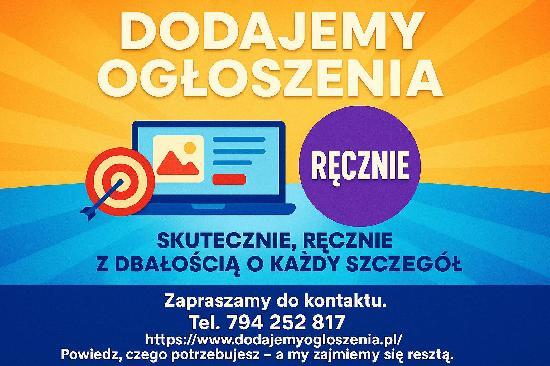 Dodajemy og³oszenia do setek portali - lokalnie lub na ca³± Szukasz skutecznego sposobu na dotarcie z og³oszeniem do wiêkszej liczby osób? A mo¿e zale¿y Ci na tym, by Twoja oferta pojawi³a siê w konkretnym województwie lub regionie? Dobrze trafi³e¶.Zajmujemy siê rêcznym dodawaniem og³oszeñ do ró¿nych portali - zarówno ogólnopolskich, jak i lokalnych. Dzia³amy elastycznie: mo¿esz wybraæ zasiêg ogólnopolski albo wskazaæ konkretne województwa, które Ciê interesuj±. My zajmiemy siê ca³± reszt±. Ka¿de og³oszenie dodajemy rêcznie - bez automatów. Mo¿emy te¿ przygotowaæ dla Ciebie atrakcyjn± tre¶æ og³oszenia - napisan± w sposób przystêpny i zachêcaj±cy - oraz grafikê, która bêdzie przyci±gaæ uwagê. Po zakoñczonej publikacji otrzymasz od nas przejrzysty raport z linkami do wszystkich miejsc, w których pojawi³o siê og³oszenie. Wszystko odbywa siê w przejrzysty sposób i z dba³o¶ci± o jako¶æ. Dzia³amy szybko, rzetelnie i indywidualnie podchodzimy do ka¿dej osoby. Je¶li chcesz, napisz do nas - chêtnie doradzimy, jaki zakres i forma og³oszenia bêd± najskuteczniejsze w Twoim przypadku. Zapraszamy do kontaktu. Tel. 794 252 817 https://www.dodajemyogloszenia.pl/ Galeria: Kontakt: reklamowanie reklamowanie e-mail: reklamowanie@op.pl tel. 794252817 woj. mazowieckie miasto: P³ock Lokalizacja: Og³oszenie dodane dnia: 25-08-2025 Aktywne do dnia: 25-08-2026 Odwiedzono: 242 razy |