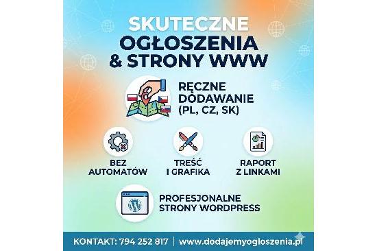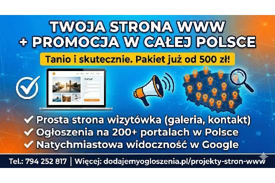 Strona internetowa od 500 PLN z mocną promocją na START/ FAK Nie chcesz wydawać fortuny na stronę internetową? Świetnie - mamy coś w sam raz dla Ciebie!W ramach naszej oferty „Strona wizytówka - pakiet podstawowy” stworzymy dla Ciebie prostą, przejrzystą stronę za jedyne 500 zł, która zawiera wszystko, czego naprawdę potrzebujesz: - stronę główną z najważniejszymi informacjami, - galerię zdjęć, - dane kontaktowe wraz z formularzem. Ale to dopiero początek! W ramach oferty „Strona WWW - pakiet standardowy” dodamy ogłoszenie promujące Twoją stronę do 200 portali ogłoszeniowych w całej Polsce - zarówno regionalnych, jak i ogólnopolskich. Dzięki temu od razu zyskasz widoczność w sieci i dotrzesz do tysięcy potencjalnych klientów bez żadnych dodatkowych kosztów reklamy. To idealne rozwiązanie, jeśli: - dopiero zaczynasz i nie chcesz inwestować dużych kwot, - potrzebujesz szybkiego i skutecznego sposobu na zaistnienie w Internecie, - chcesz, aby Twoja firma była łatwa do znalezienia w Google i portalach ogłoszeniowych. Tanio i skutecznie - Twoja strona + promocja w całej Polsce w jednym pakiecie. Tel.: 794 252 817 Więcej informacji: dodajemyogloszenia.pl/projekty-stron-www Galeria: Kontakt: reklamowanie reklamowanie e-mail: reklamowanie@op.pl tel. 794252817 woj. mazowieckie miasto: Płock Lokalizacja: Ogłoszenie dodane dnia: 09-12-2025 Aktywne do dnia: 09-12-2026 Odwiedzono: 153 razy |