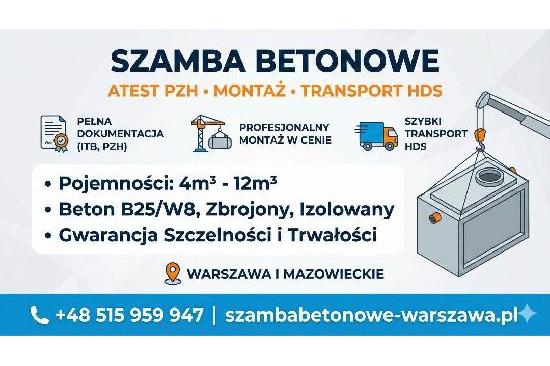 Szamba Betonowe Płock Atest PZH, Montaż, Transport HDS Oferujemy wysokiej jakości szamba betonowe z transportem i montażem na terenie Mazowsza.Nasze zbiorniki to gwarancja szczelności i trwałości na lata. - Pojemności: od 4m3 do 12m3 (jednokomorowe, dwukomorowe, wielokomorowe). - Wykonanie: Beton wysokiej klasy (B25/W8), zbrojony, podwójnie zabezpieczony hydroizolacją. - Dokumentacja: Komplet dokumentów do odbioru budynków (Atest PZH, Aprobata ITB, gwarancja pisemna). W cenie zapewniamy: - Profesjonalny transport samochodem z dźwigiem HDS. - Montaż zbiornika w przygotowanym wykopie. - Płytę, kominek i właz betonowy. Działamy w całym województwie mazowieckim. Szybkie terminy realizacji! Zadzwoń i zapytaj o cenę: +48 515 959 947 Więcej na: szambabetonowe-warszawa.pl szamba betonowe, producent szamb betonowych, szczelne szamba betonowe, montaż szamba betonowego, transport szamba betonowego, szambo z montażem, wytrzymałe szamba betonowe, szamba betonowe cennik, szambo betonowe od producenta, fachowe doradztwo szamba betonowe, piwniczki ogrodowe betonowe, kanały samochodowe betonowe, serwis szamb betonowych, zamówienie szamba Galeria: Kontakt: ogloads ogloads e-mail: ogloads@op.pl tel. 111111111 woj. mazowieckie miasto: Polska Lokalizacja: Ogłoszenie dodane dnia: 25-11-2025 Aktywne do dnia: 25-11-2026 Odwiedzono: 161 razy |